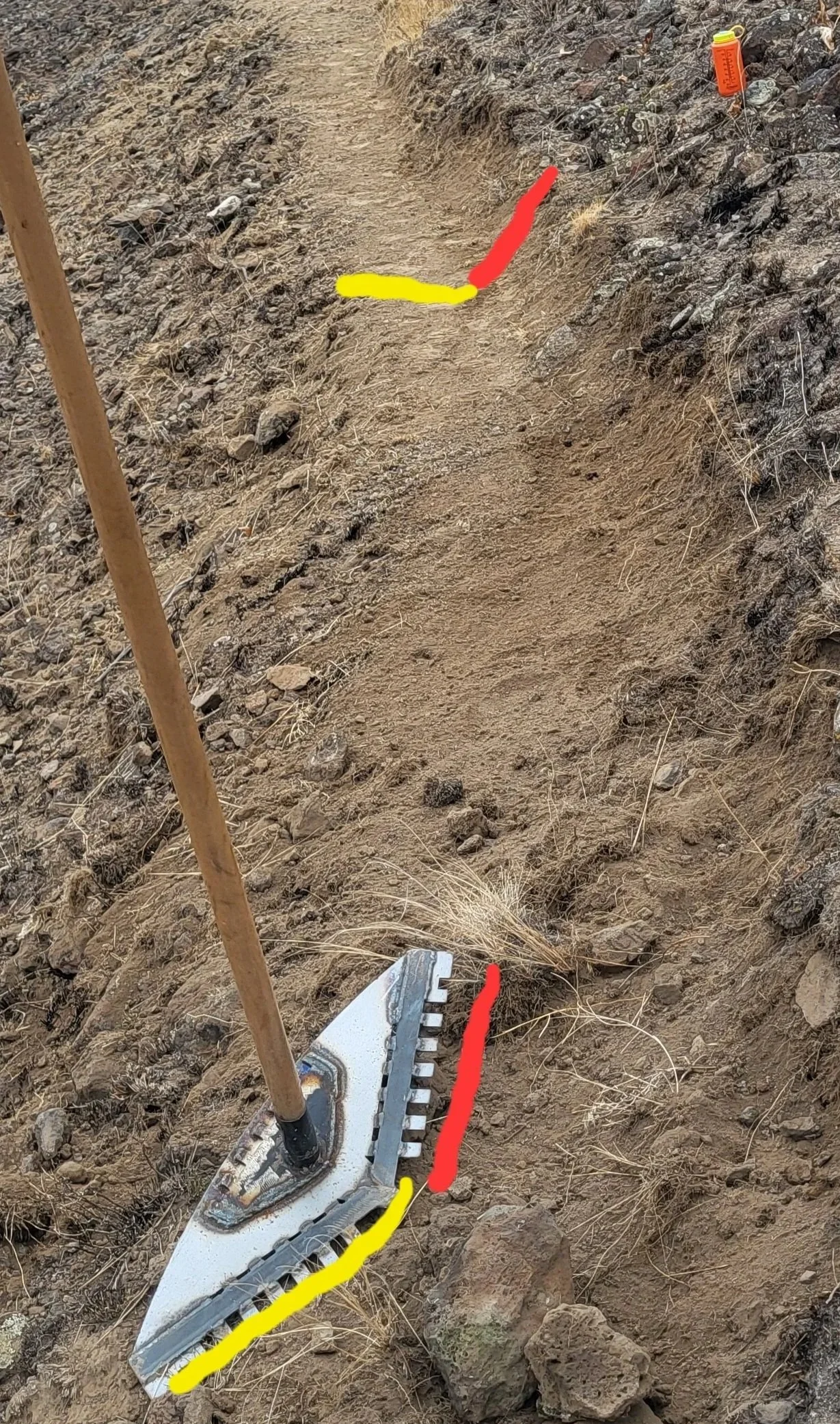 The patent pending HEW rake was created to make trail work easier. The main design feature is the long face with the point in the middle. It’s designed to grab the trail bed and the backslope at the same time, automatically setting the backslope angle and guiding the work. Flip it over and there is a 16 or 18” flat rake. Turn it on the long end and you’re swinging a medium duty railroad pick, especially the .25” thick rake. In the various configurations these tools are weighing in between 5-7lbs. The tool in the picture is the 1st generation tool. It was the shape that proved the concept worked.